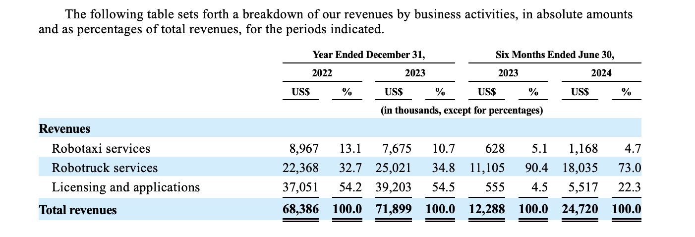 小馬智行招股書(shū)顯示,公司營(yíng)收主要來(lái)源于自動(dòng)駕駛出行服務(wù)(主要為Robotaxi)、自動(dòng)駕駛貨運(yùn)服務(wù)(Robotruck)、技術(shù)授權(quán)與應(yīng)用服務(wù)三大板塊。pnY驛資訊